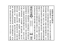 張氏始祖張載。城灣支始祖為守章公,由陜西鳳翔縣遷移城灣定居。卷一:家訓、譜序、祠規等。卷二像贊綜合資料等。卷四開始為團灣張氏世系世表。