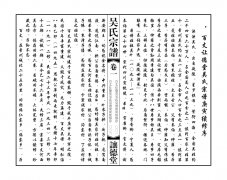 · 提 要本譜始祖吳玠(一○九三—一一三九),字晉卿,寧夏人,為泰伯第七十四世。宋代四川宣撫使。弟璘,字唐卿,官太傅,封新安郡王,均為抗金名將,中興重臣。長子拱,次子撫,扈駕南渡,遂遷江南。拱公后裔秉德,長子,為圩塘吳家村始遷祖;秉德弟秉常之子佩,為百丈河東支始遷祖;撫公后裔秉珙子倀、秉誠子俸、秉澤子僖,為胡莊戴家村、卞墅談家村、溝東村、丁莊村諸支之始遷祖。卷一凡例、譜序、像贊、跋等。卷二統宗世系圖、百丈河西河東世系圖。卷三卷四為世表部分。