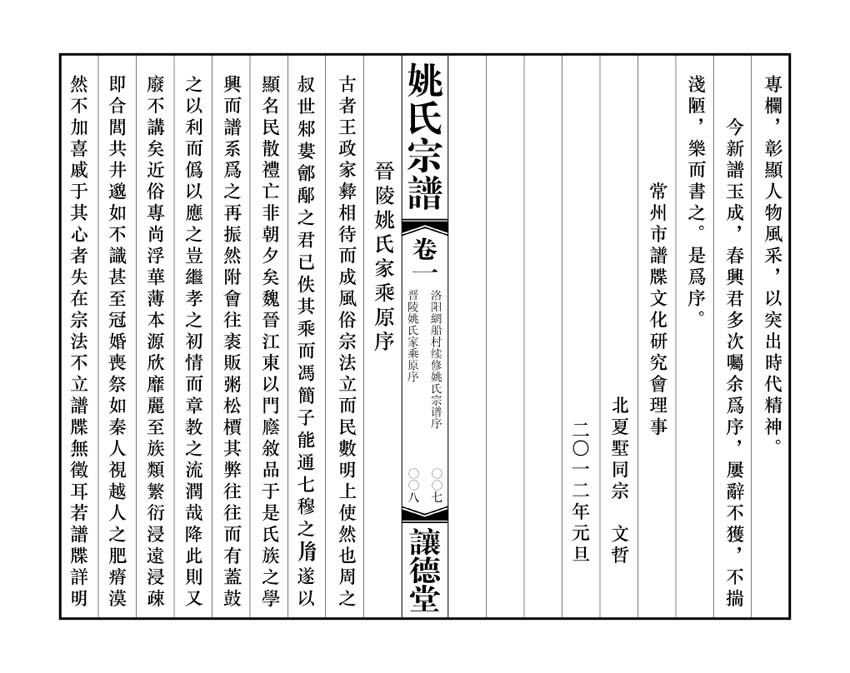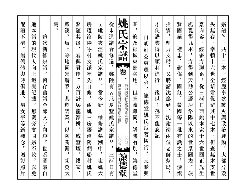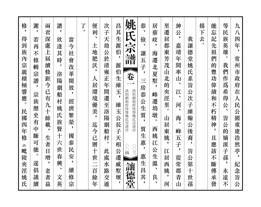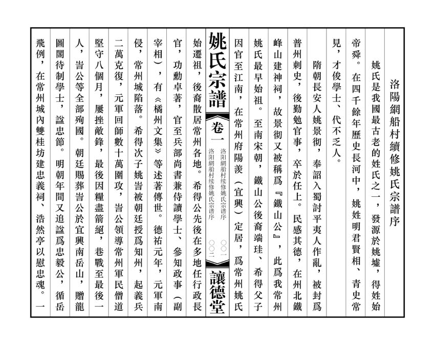 · 提 要隋朝長安人姚景徹,被稱爲『鐵山公』,此爲我常州姚氏最早始祖。至南宋朝,鐵山公後裔端珪、希得父子因官至江南,在常州府陽羨(宜興)定居,爲常州姚氏始遷祖。我讓德堂姚氏系訔公次子維翰公後裔,訔公第十世孫紳公,嘉靖年間率山、江、河、海、峰五子,從常郡青山里遷居郡東芳茂山北的夾涇里。山居東姚,江居西姚,河居蔡歧,海遷北夏墅,峰遷塢墩。西姚江公生溫、良、恭、儉、讓五子,三房恭公生質,質生惠,惠生昌其,昌其生源伯,源伯生維玉,維玉公長子天相公遷戚墅堰,次子天助公於清雍正年間遷至洛陽網船村。