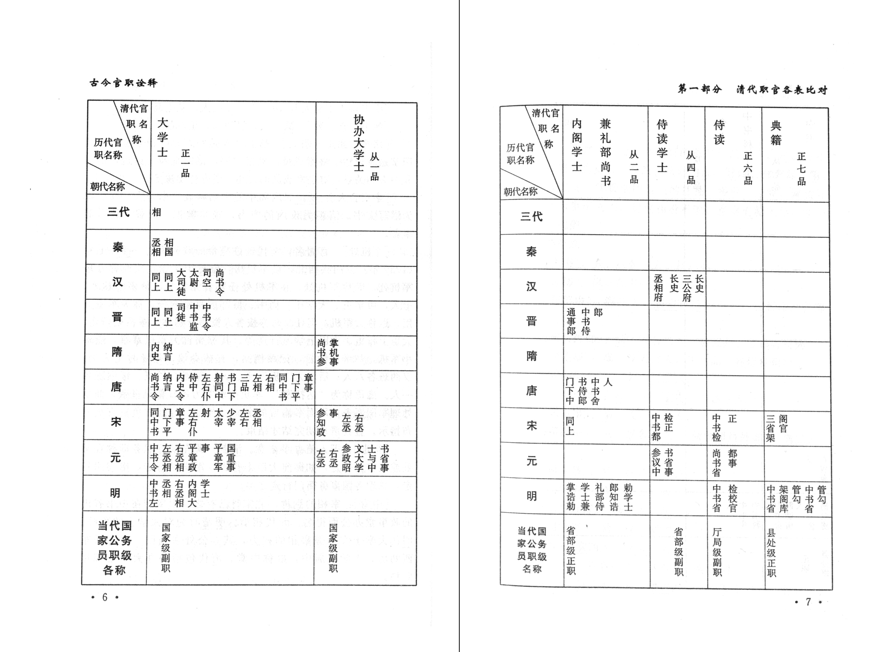 本書的框架設計(一部分是古今官名對照表,一部分是古代職官釋詞)正適應了廣大讀者的需要,恰恰也是本事的特點。看到一個古代的官名,很多人都想知道它相當于今天的什么職位。以古比今,以今對古,這種思維方式并非今天的讀者所擁有,就是在古代,人們也很想弄清前朝某官相當于當時的某官。